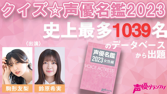 月刊誌『声優グランプリ』名物付録「声優名鑑」。発売中の最新3月号に付く「声優名鑑2023 女性編」では歴代最多となる総勢1039名の女性声優が掲載されています。昨年に続き「声優名鑑」をデータベースとしたクイズ番組の放送が決定。パーソナリティを務めるのは2023年版にて初掲載となる鈴原希実さん、2013年版に初掲載となった駒形友梨さんのコンビ。『クイズ☆声優名鑑2023』は2月22日(水)20時00分から生放送!