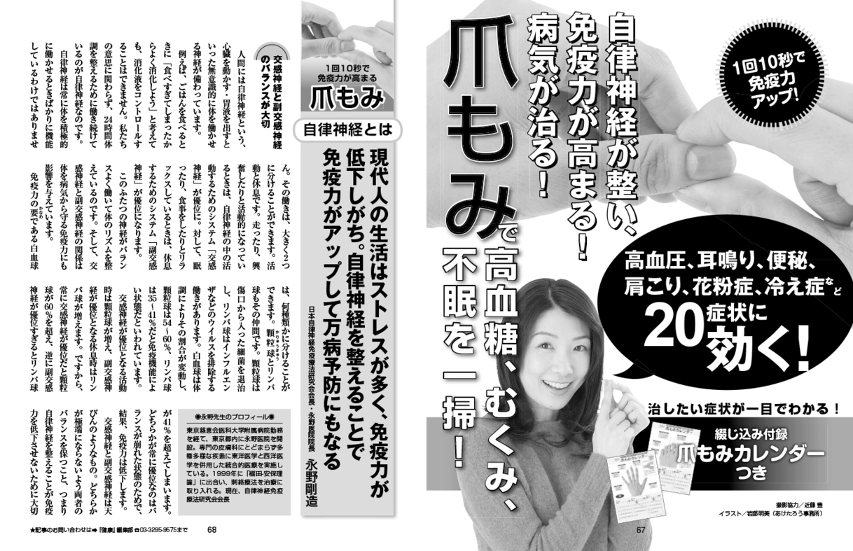 - 大特集 高血圧、耳鳴り、便秘、肩こり、花粉症、冷え症など20症状に効く! 1回10秒で免疫力アップ!自律神経が整い、免疫力が高まる!病気が治る! 爪もみで高血糖、むくみ、不眠を一掃!